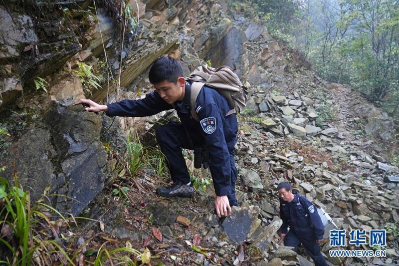 陳亮亮(左)和護(hù)林員攀爬巡護(hù)線路中的一處陡坡(3月17日攝)。新華社記者 萬象 攝