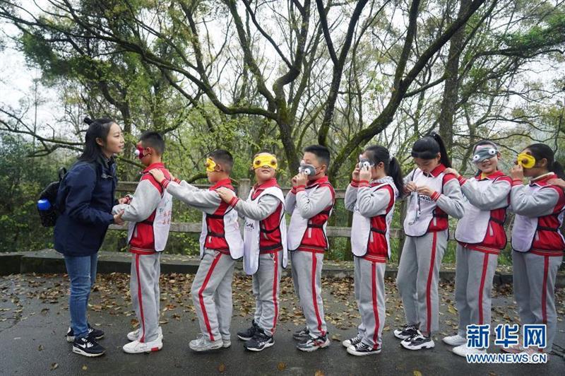 在九嶺山國家級(jí)自然保護(hù)區(qū),鄒鴻堰(左一)帶領(lǐng)孩子們走進(jìn)森林,用聽覺感受大自然的聲音(3月18日攝)。新華社記者 萬象 攝