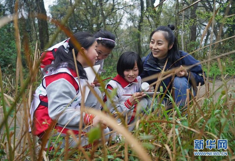 在九嶺山國家級(jí)自然保護(hù)區(qū),鄒鴻堰(右一)給孩子上自然體驗(yàn)課(3月18日攝)。新華社記者 萬象 攝