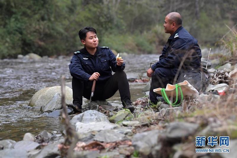 在巡護(hù)途中,湯勇(左)和同事在溪流邊休息吃干糧(3月17日攝)。新華社記者 彭昭之 攝