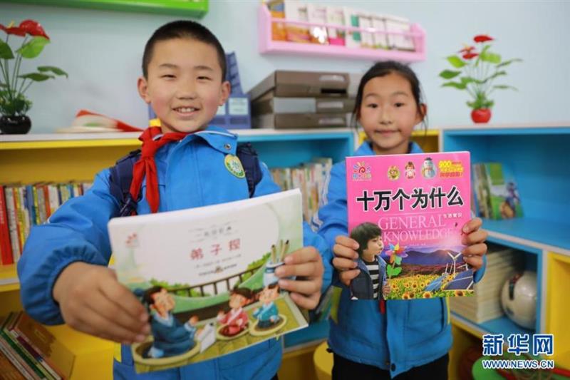 4月22日,在蘭州新區(qū)第二小學,孩子們展示收到的新書。