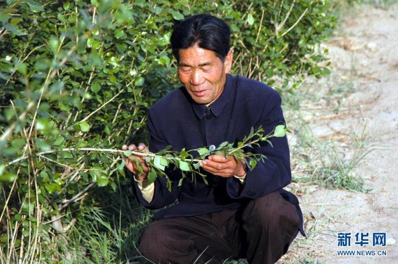 石述柱在甘肅省民勤縣宋和村查看樹苗長勢(2005年5月19日攝)。新華社記者 聶建江 攝