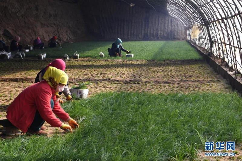 甘肅省民勤縣大壩鎮(zhèn)八一村村民在日光溫室大棚內(nèi)收割沙蔥(2020年1月12日攝)。新華社記者 馬寧 攝