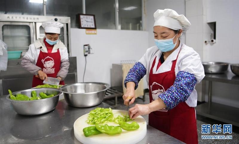 圖為鶴峰縣中營鎮(zhèn)民族中心學(xué)校的廚師正在切菜。新華網(wǎng)發(fā) 楊順丕攝