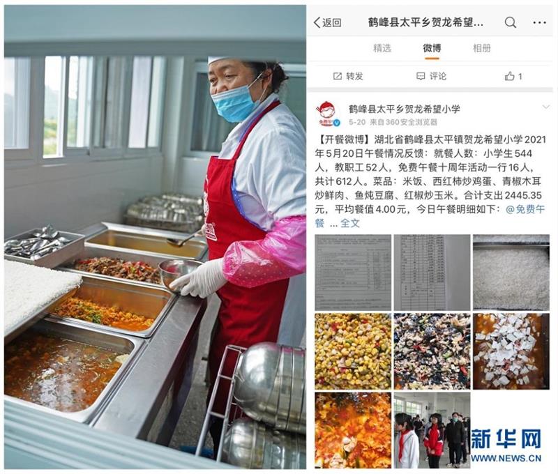 圖為鶴峰縣太平鎮(zhèn)賀龍希望小學(xué)的餐廳員工正在備餐(左);學(xué)校微博公示當(dāng)日菜品及就餐情況(右)。十年來,鶴峰縣不斷規(guī)范免費午餐的運營管理,教育、工商、食藥監(jiān)等職能部門定期或不定期進行食堂安全衛(wèi)生檢查,監(jiān)督飯菜質(zhì)量??h內(nèi)所有免費午餐學(xué)校均堅持每個開餐日公示孩子們的伙食、采購信息及就餐情況等。新華網(wǎng) 吳文華攝