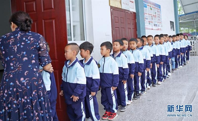 圖為鶴峰縣太平鎮(zhèn)賀龍希望小學(xué)的學(xué)生們排隊進入食堂領(lǐng)取免費午餐。新華網(wǎng) 吳文華攝