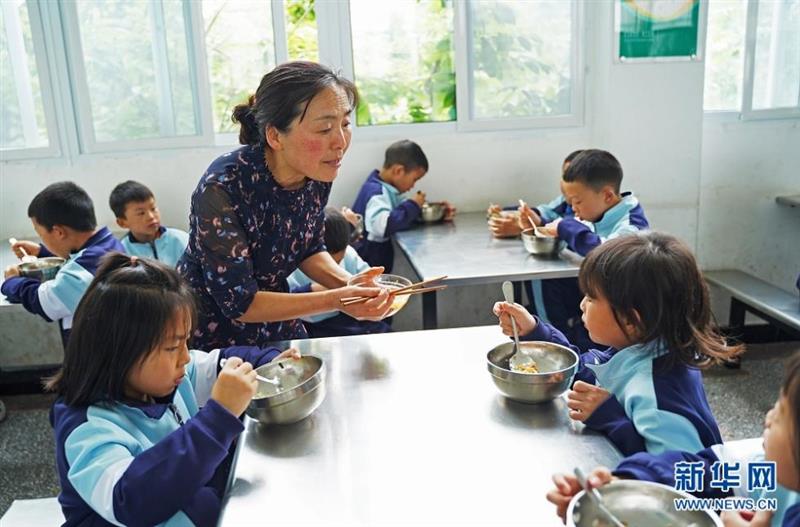 圖為鶴峰縣太平鎮(zhèn)賀龍希望小學(xué)的老師楊雙嵐和學(xué)生一起就餐。新華網(wǎng) 吳文華攝