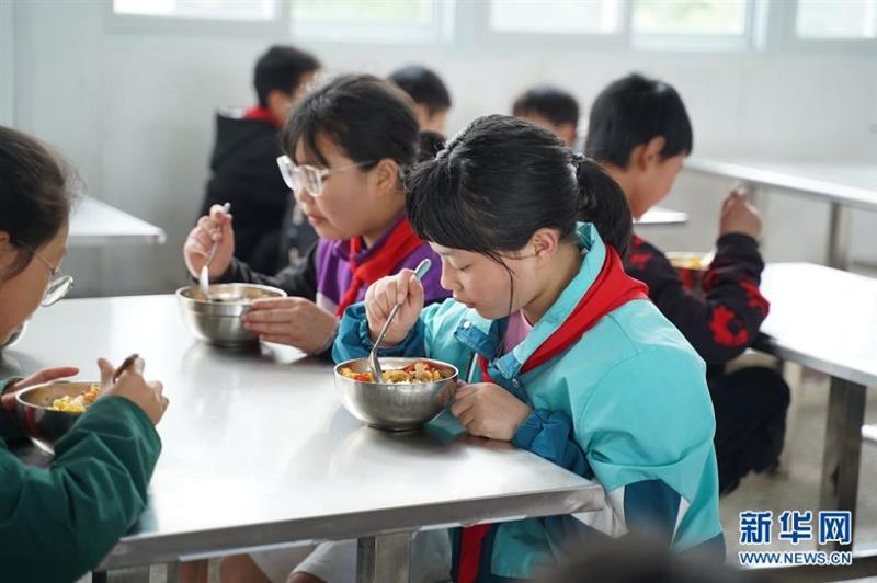 圖為鶴峰縣太平鎮(zhèn)賀龍希望小學(xué)五年級學(xué)生向媛(右一)正在吃免費午餐。她說,學(xué)校菜品豐富、葷素搭配。除了免費的早、午餐,平時還可享受學(xué)校免費住宿,減輕了家里的負(fù)擔(dān)。新華網(wǎng) 吳文華攝