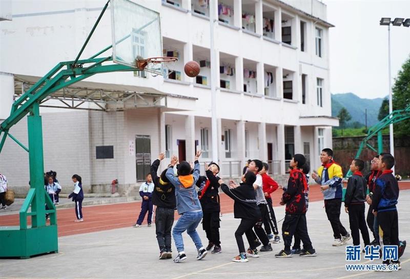 圖為午餐后,鶴峰縣太平鎮(zhèn)賀龍希望小學(xué)的學(xué)生們在操場打籃球。新華網(wǎng) 吳文華攝