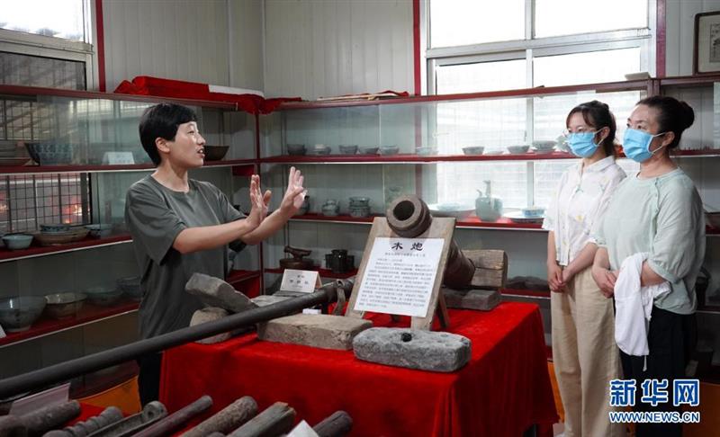 7月8日,在秦皇島市海港區(qū)的長(zhǎng)城文化展館,李翠(左一)向游客介紹長(zhǎng)城文化知識(shí)。新華社記者 金皓原 攝
