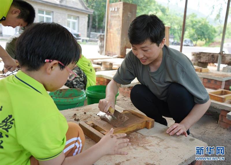7月8日,在秦皇島市海港區(qū)的板廠峪風(fēng)景區(qū),李翠與參加長(zhǎng)城文化體驗(yàn)的孩子一起做手工。新華社記者 金皓原 攝