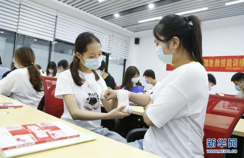 7月29日,大學生在邢臺市襄都區(qū)學習創(chuàng)傷包扎。近年來,河北省邢臺市襄都區(qū)紅十字會面向社區(qū)群眾、學校師生、企業(yè)員工等群體開展心肺復蘇、創(chuàng)傷止血包扎等自救、互救課程,增強群眾的應急處置能力。截至目前,已開展培訓40場,覆蓋約3000人次。新華社發(fā)(張馳 攝)
