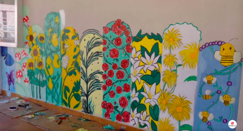 在痞幼的引導(dǎo)下,她和瀾滄一中的孩子們用四個多小時完成了這次墻面彩繪。在他們的畫筆下,浪漫的玫瑰盛開,蜜蜂蝴蝶自在飛舞,本地種的咖啡豆生生不息,每幅畫都展現(xiàn)出向陽新生的生命力。
