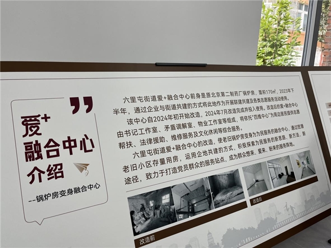 其實,六里屯街道“愛+”融合中心也是老舊小區(qū)改造的典范,其前身是原北京第二制藥廠鍋爐房,面積170平方米,2023年下半年,通過企業(yè)與街道共建的方式將此地作為開展聯(lián)建共建及各類志愿服務(wù)活動,并于2024年7月改造完成并投入使用。改造后的愛+融合中心周邊居民提供志愿幫扶、法律援助、維修服務(wù)及文化休閑等綜合服務(wù)。