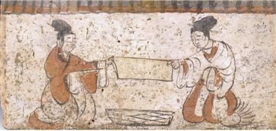 | 圖為甘肅高臺(tái)壁畫墓出土畫像磚“剪布圖”。 |
