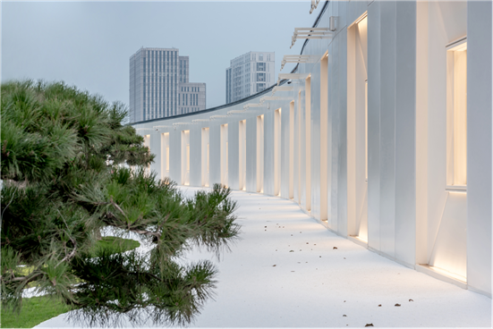 一個圓廳,被406根立柱包裹。立柱是原漿紙色,其間有玻璃幕墻,隱約透出室內(nèi)的燈光。以圓廳為起點(diǎn),一條長約300米、呈曲線造型的畫廊向東延伸,蜿蜒起伏,宛若綢帶隨風(fēng)飄擺。寂靜的夜晚,射燈映照于白墻,畫廊便彌漫出一種安靜的力量。無數(shù)光點(diǎn),被整座建筑串聯(lián)成曲折的光之海。