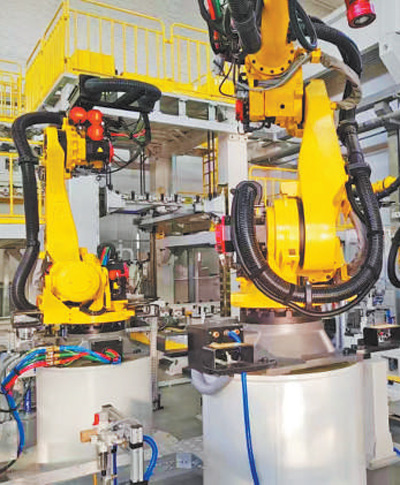 ??河北保定長(zhǎng)城精工自動(dòng)化工廠,5G—A汽車柔性產(chǎn)線上,龐大的機(jī)械臂吸起汽車頂蓋,空中盤旋一圈,便涂抹完頂蓋上的膠條,一套動(dòng)作行云流水。