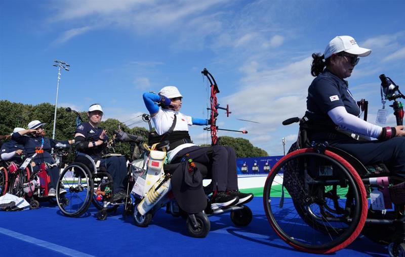 8月24日,巴黎殘奧會中國體育代表團(tuán)射箭運動員劉靜(右二)在訓(xùn)練中。新華社記者 才揚 攝