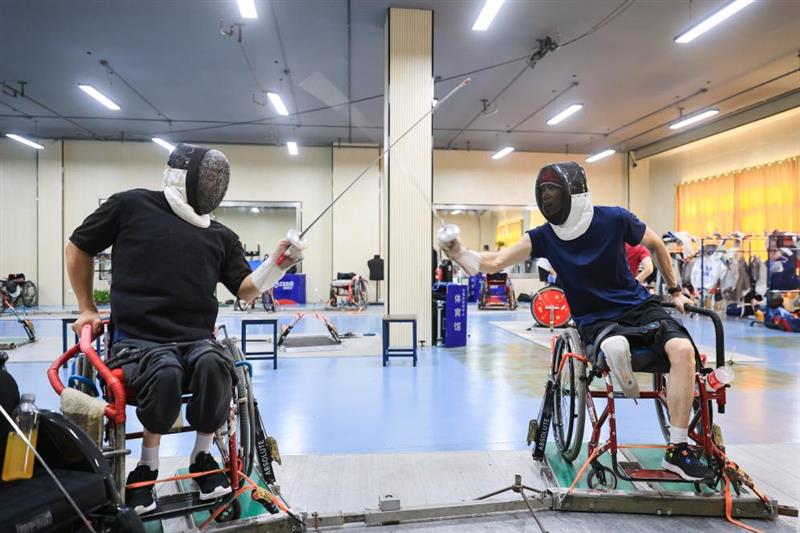 8月12日,中國輪椅擊劍集訓(xùn)隊(江蘇組)運動員胡道亮(左)和仲賽春在訓(xùn)練中。新華社發(fā)(蘇陽攝)