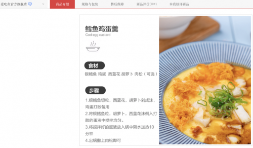 “愛吃魚”提供的是一套優(yōu)質(zhì)蛋白輔食解決方案,意在為中國家庭帶來北歐的品質(zhì)味道。因此除了優(yōu)質(zhì)產(chǎn)品,愛吃魚還致力于為客戶提供精細(xì)化指導(dǎo)和建議以及烹飪方法。在“愛吃魚”的京東旗艦店的商品頁面,可以看到針對具體食材,推薦了各種簡單易操作的精美菜譜。