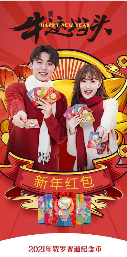 以“牛運(yùn)同?!泵亩堆b產(chǎn)品則內(nèi)含1卷20枚的賀歲牛年流通幣,配以“牛運(yùn)同福”圓筒及外包裝,預(yù)計將在春節(jié)后開始限量發(fā)售。